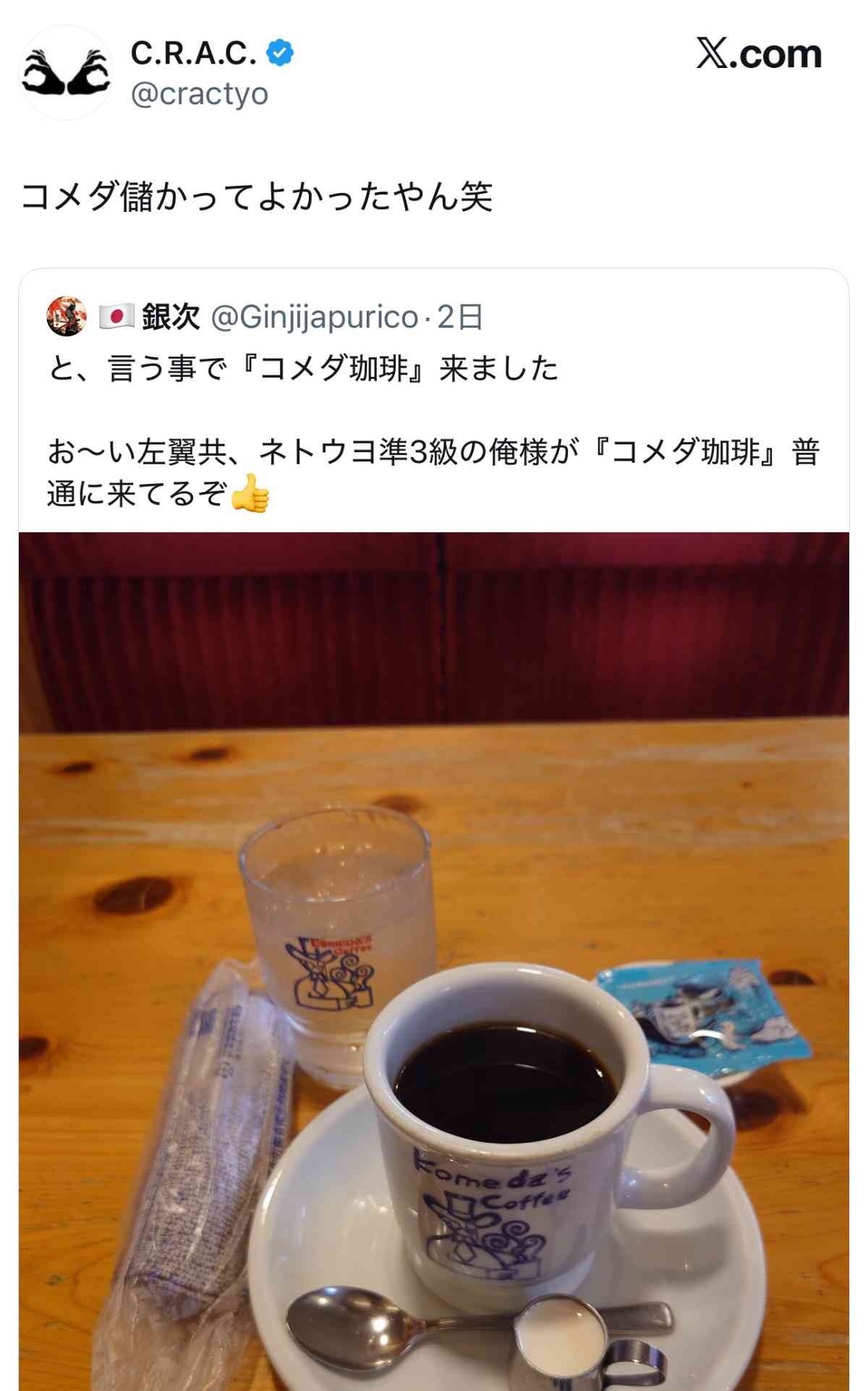 ネット民「ネトウヨがいないコメダ最高!」▶ネトウヨ「コメダ珈琲に来ました。左翼ざまあ!」無事コメダの売上に貢献へ…