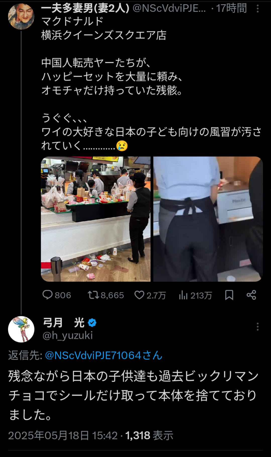 ネトウヨ「中国人がハッピーセット捨ててる!」人気マンガ家「でもビックリマンチョコ捨ててましたよね日本人😅」