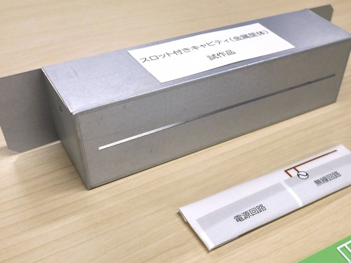 同社が開発した「金属ロバストアンテナ」は、金属箱に細長い開口部を設けた「スロット付きキャビティ」と内部アンテナを組み合わせ、両者を同一周波数で共振させる構造を採る。内部アンテナで励振すると金属箱内部に定在波が形成され、筐体全体が共振体として機能する。スロットはそのエネルギーを外部へ放射する窓として働き、金属筐体内部にアンテナを収めたまま安定した通信を可能にする。