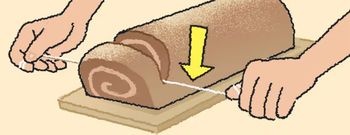 デンタルフロスの両端をしっかりと握り、上から下にゆっくり押すと、形を崩さずにパンを切ることができる。