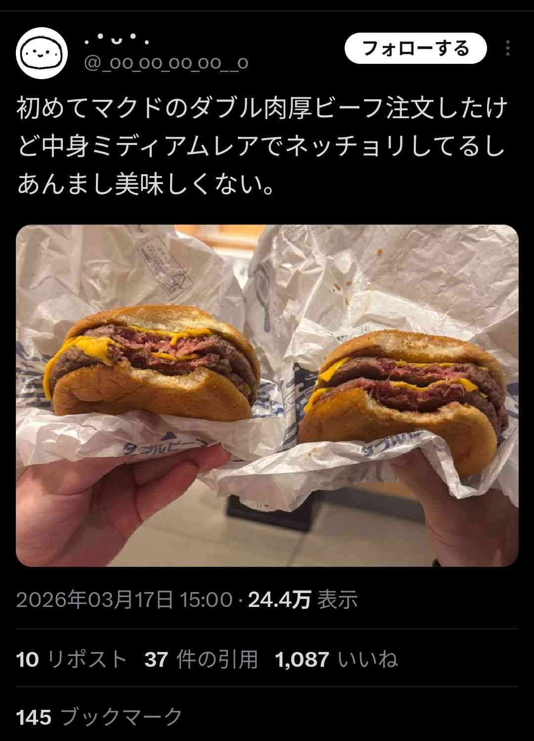 初めてマクドのダブル肉厚ビーフ注文したけど中身ミディアムレアでネッチョリしてるしあんまし美味しくない。