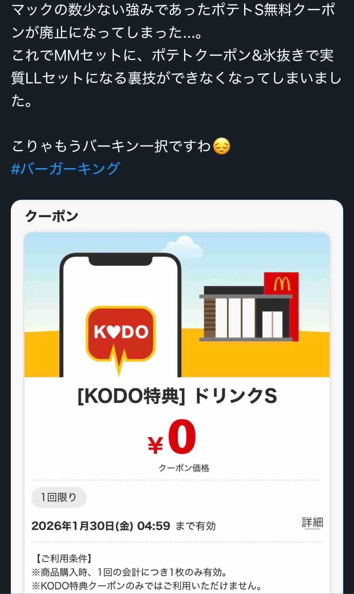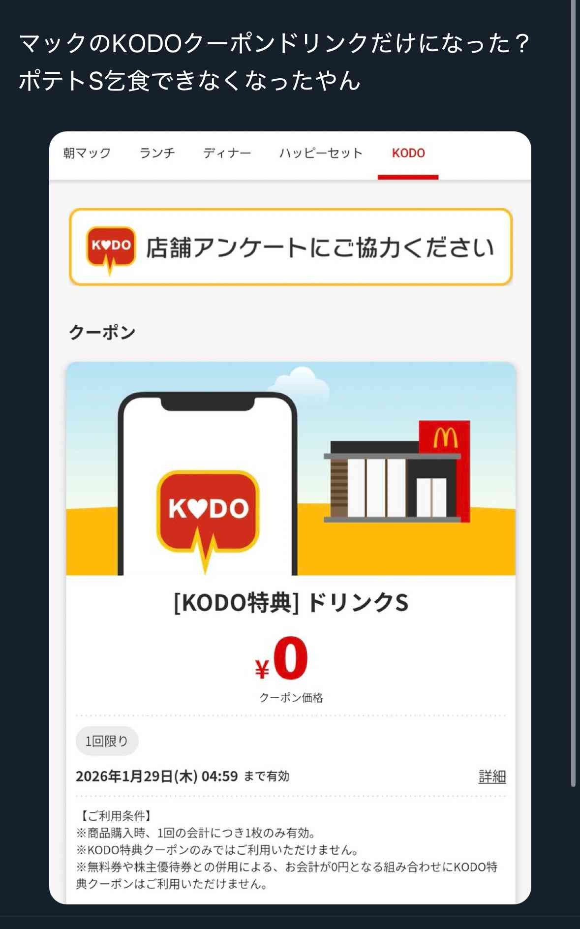 マックのアンケートでもらえるクポーンがケチくなってる😭😭😭ドリンクSしか選べなくなった😭😭😭