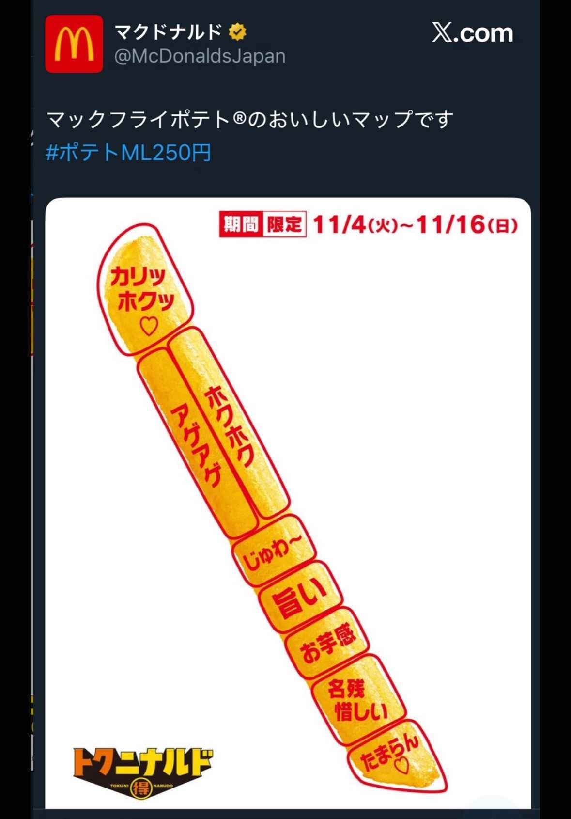 マック公式がポテチンポって投稿して即消しとか、どんな誤爆やねん担当者震えてるやろな