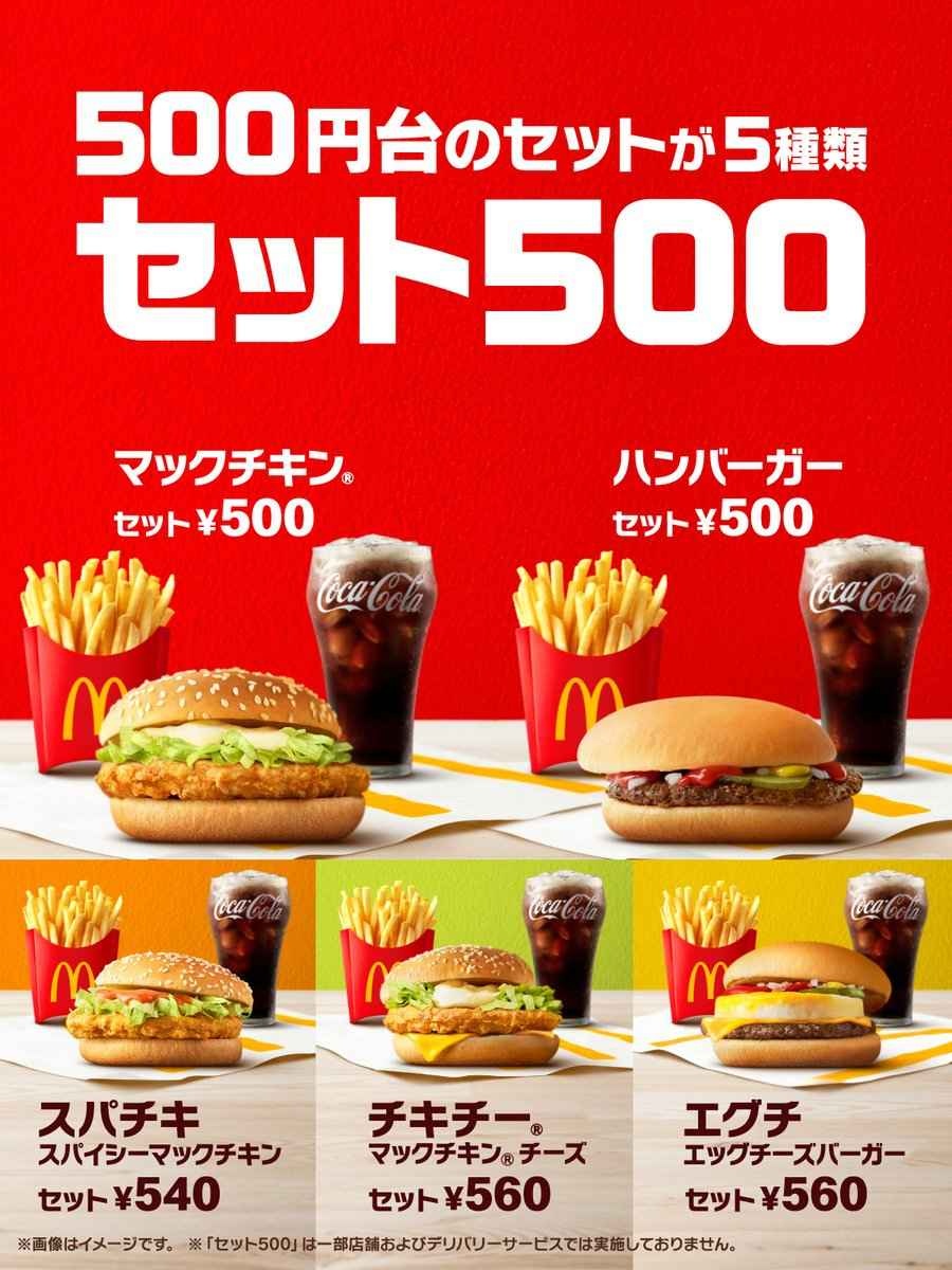 バーガーに、選べるサイドメニューとドリンクMがついて500円台!『セット500』は、平日も土日も、昼も夜もおトク!