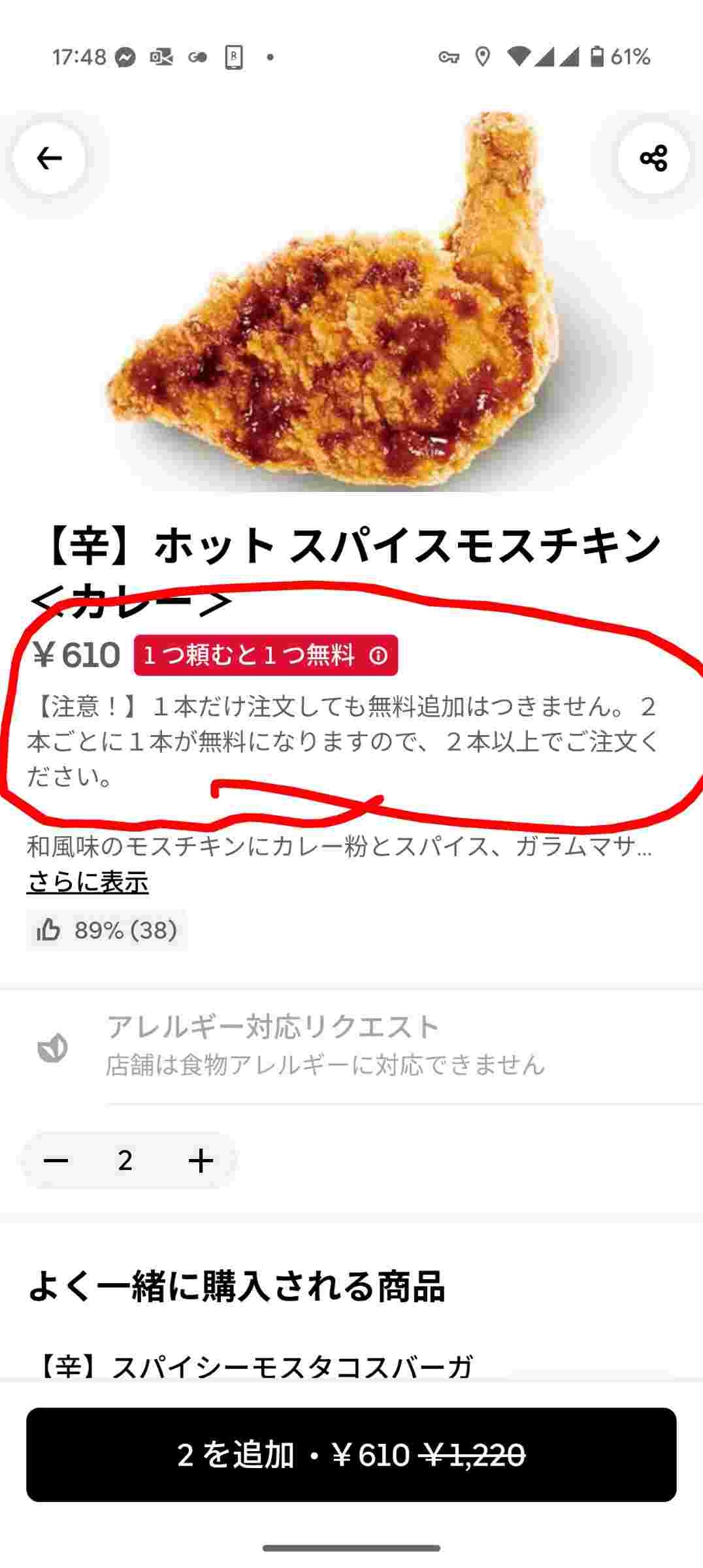 2個頼んだら片方無料の形式だから1個だけ頼んでも意味ないよってだけの話じゃねえの