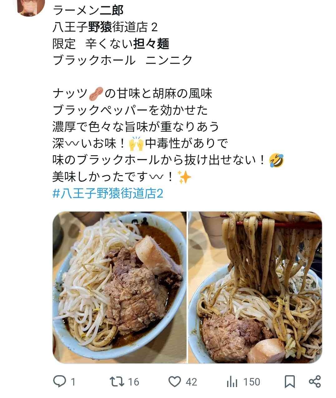 ラーメン二郎「ほいよ、黒胡麻担々麺(辛くないョ☺)」