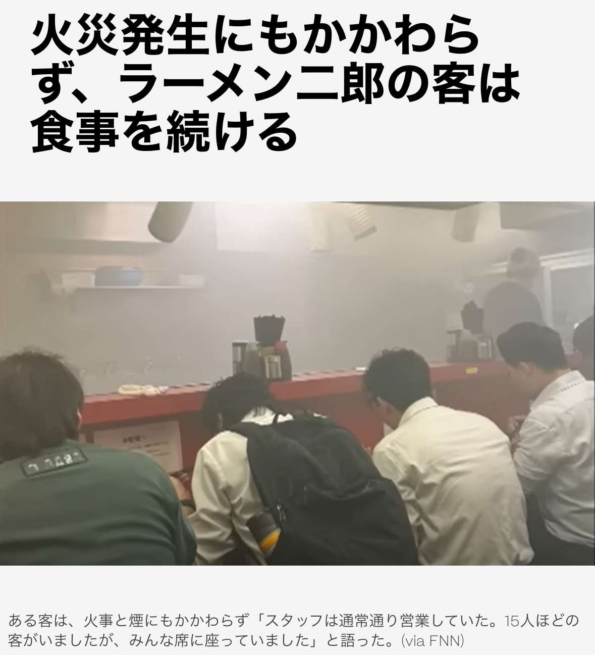 実際、ラーメン二郎が「指示待ち人間のユートピア」と化していることを象徴するような「出来事」がちょっと前にあった。2024年5月、ラーメン二郎 新宿歌舞伎町店で火災があったのだが、それを報じたテレビの映像の中で、煙が出ている店内でラーメンを食べ続けている客のシーンが流れて大きな話題になったのである。