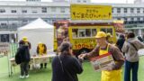 周囲に田畑が広がる田舎のスーパーの駐車場で青空市場よ