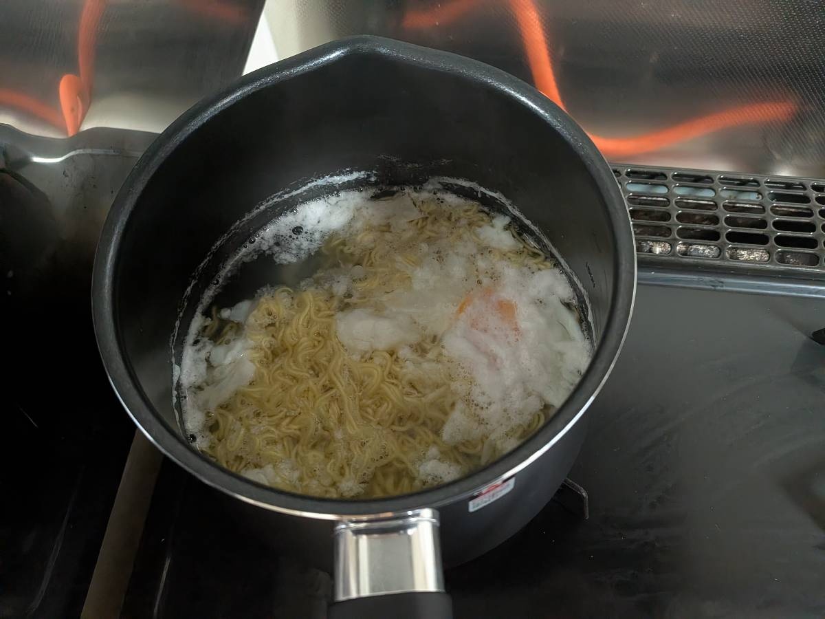 ラーメン鍋に入れて残り2分で生卵投入