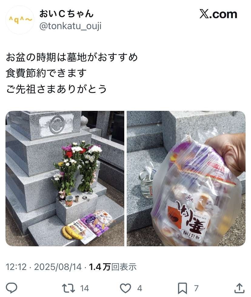 ( ヽ´ん`) 「墓地に行って食べ物をかき集めれば実質0円」
