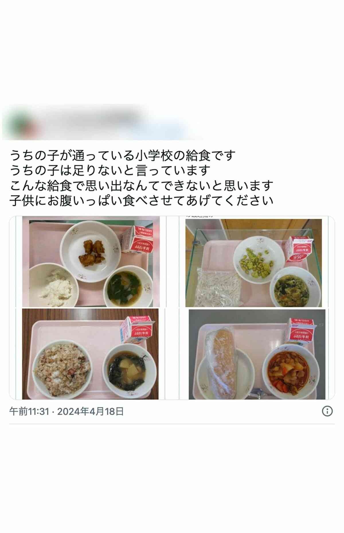 小4の子を持つ投稿者「子どもに『きょうは唐揚げだったね。どうだった?』と聞くと、『小さな唐揚げが3つだった』、『シューマイが1個だった』。そういう日は息子も『足りなかった』、『寂しかった』と言う。“一汁三菜”など国が言う食育から、かけ離れている」