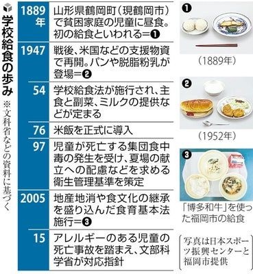 文部科学省などによると、国内初の給食は1889年、山形県で困窮家庭の児童に出された食事とされる。戦争で中断し、戦後は外国から届いた支援物資が子どもの胃袋を満たした。1954年制定の学校給食法で、「パンや米飯」に「おかず」「ミルク」の「完全給食」を提供する環境が整った。