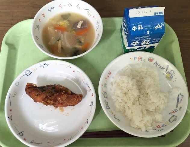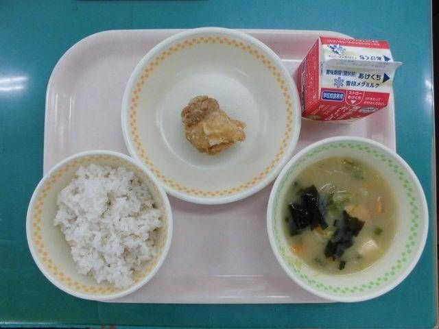 福岡市学校給食公社のホームページによると、この献立は、麦ごはん、鶏の唐揚げ1個、春キャベツのみそ汁、牛乳だった。計620キロカロリーあり、1食あたり600キロカロリーの市の基準を満たしていた。