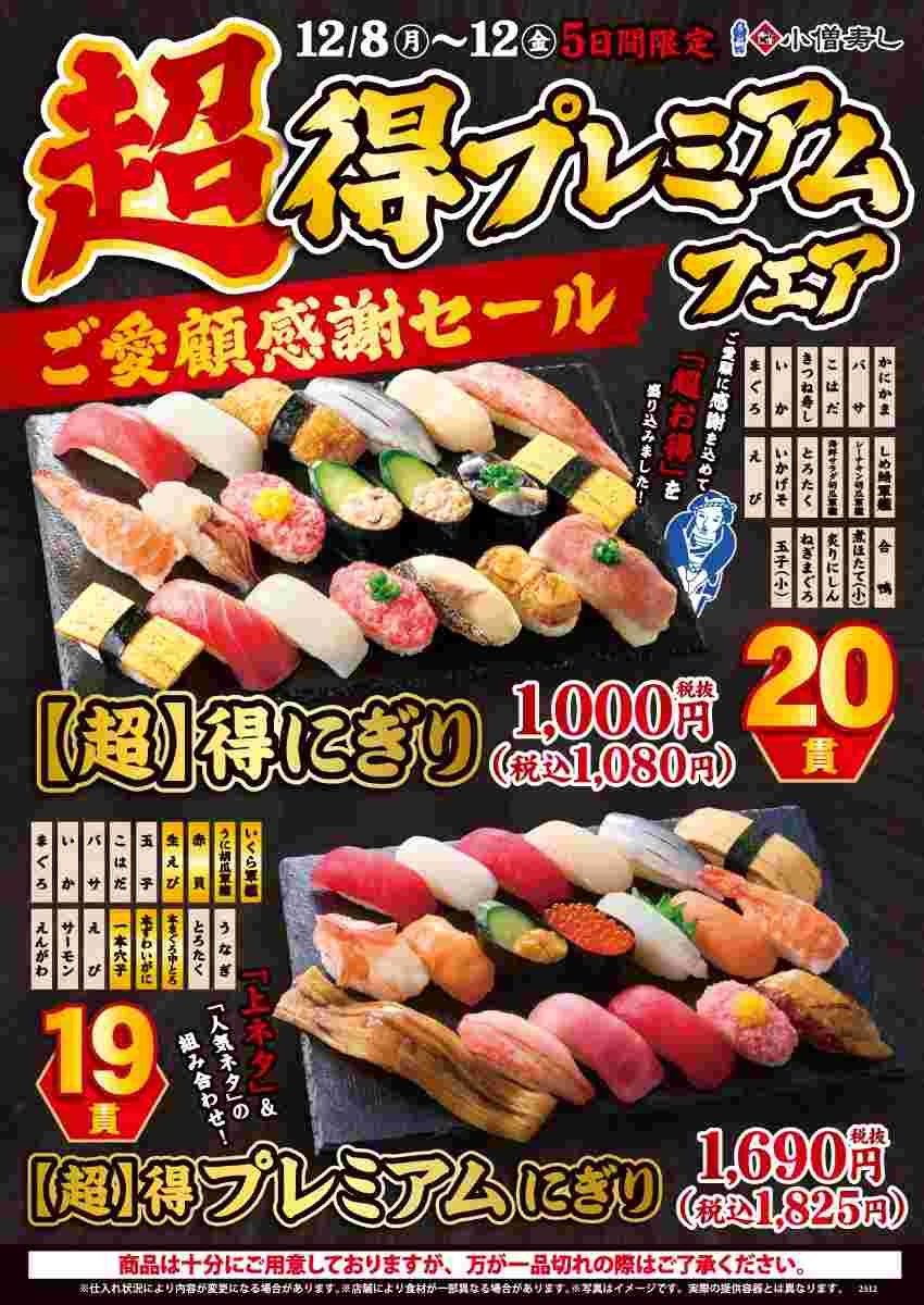 【5日間限定】寿司20貫・1,080円など、「【超】得プレミアムフェア」開催/ 12月8日から【小僧寿し】