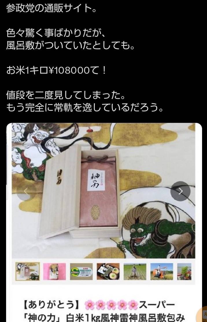 参政党🍊「スーパー神の力米」という謎の白米を1kg10万円で販売 [165981677]