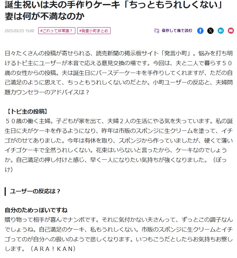 50歳の働く主婦。子どもが家を出て、夫婦2人の生活にやる気を失っています。私の誕生日に夫がケーキを作るようになり、昨年は市販のスポンジに生クリームを塗って、イチゴがのせてありました。今年は有休を取り、スポンジから作っていましたが、硬くて薄いイチゴケーキで全然うれしくない。花束はいらないと言ったから、ケーキなのでしょうか。自己満足の押し付けと感じ、早く一人になりたい気持ちが強くなりました。(ぽっけ)ケンモジの反応は?