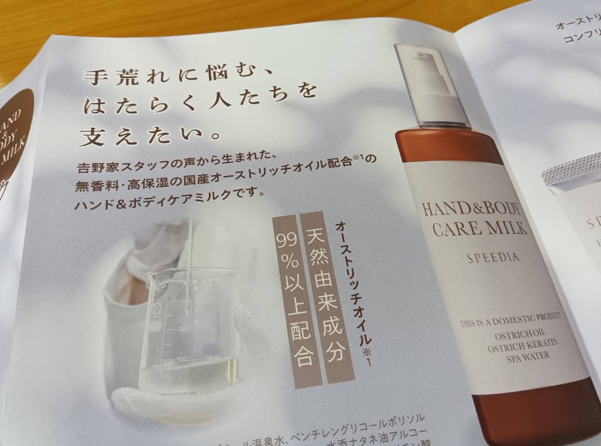 なんでも、このハンド&ボディケアミルクは吉野家スタッフの声から生まれたものらしい。言われてみれば、吉野家は水仕事が多そうだ。手荒れは隠れた悩み事なのかもしれない。
