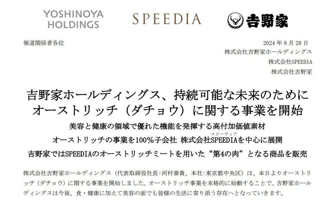 吉野家ホールディングスは聞き慣れない「オーストリッチ」事業を開始すると発表した。これはダチョウのこと。数年前から世間がダチョウの免疫力の高さに注目し、抗体を生産する技術については聞いたことがあった。しかし、その波が吉野家にまで押し寄せていたとは。