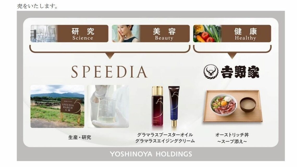 吉野家は子会社のSPEEDIAをもち(余談だが私は一瞬、某有名情報プラットフォームと読み間違え、吉野家がいつのまに買収していたのだ、と驚いた)、茨城県石岡市にある牧場ではダチョウ500羽を飼育している。