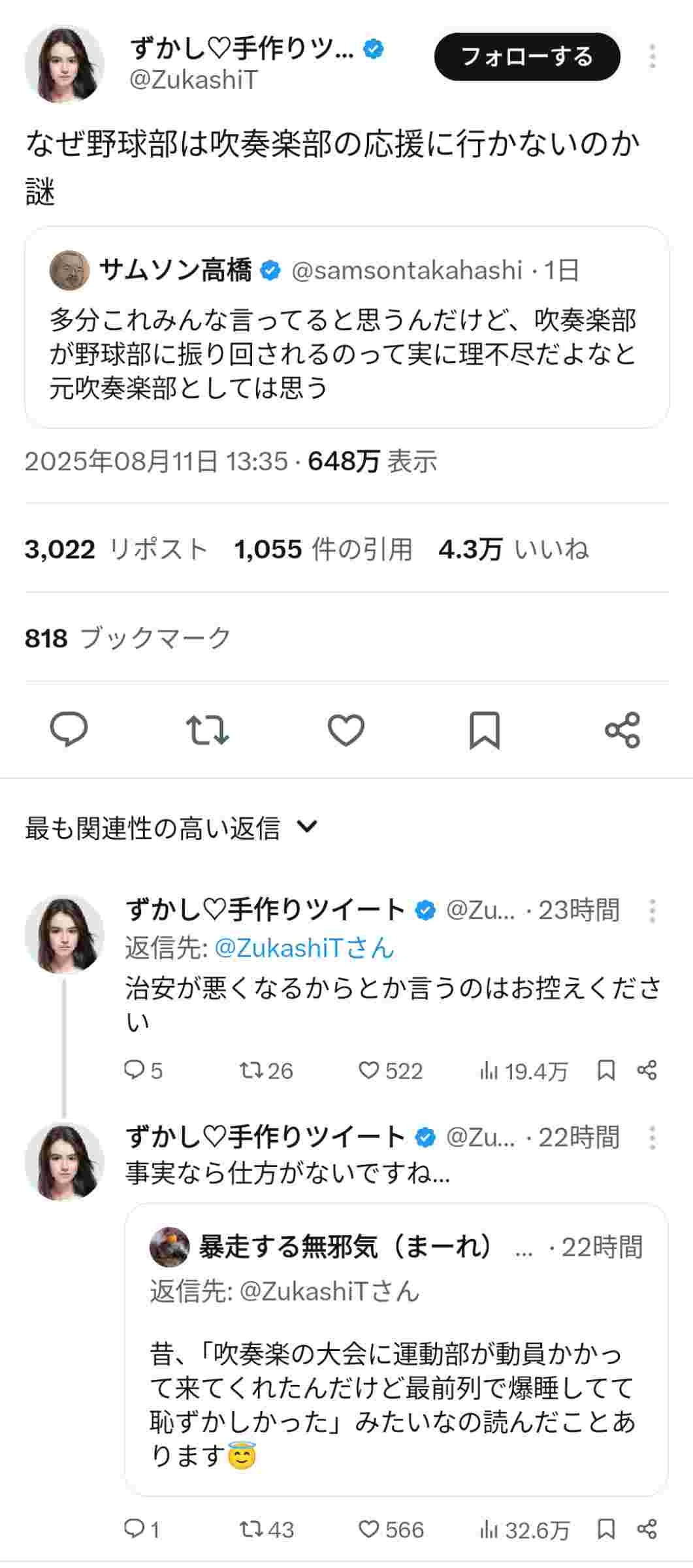 吹奏楽部、甲子園に苦言「練習にならない低レベルの曲多い」「野球部は応援来ないくせに」「なぜフェラ野郎を応援しないといけない?」