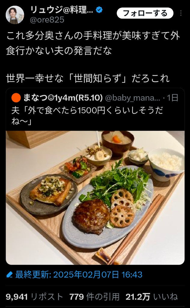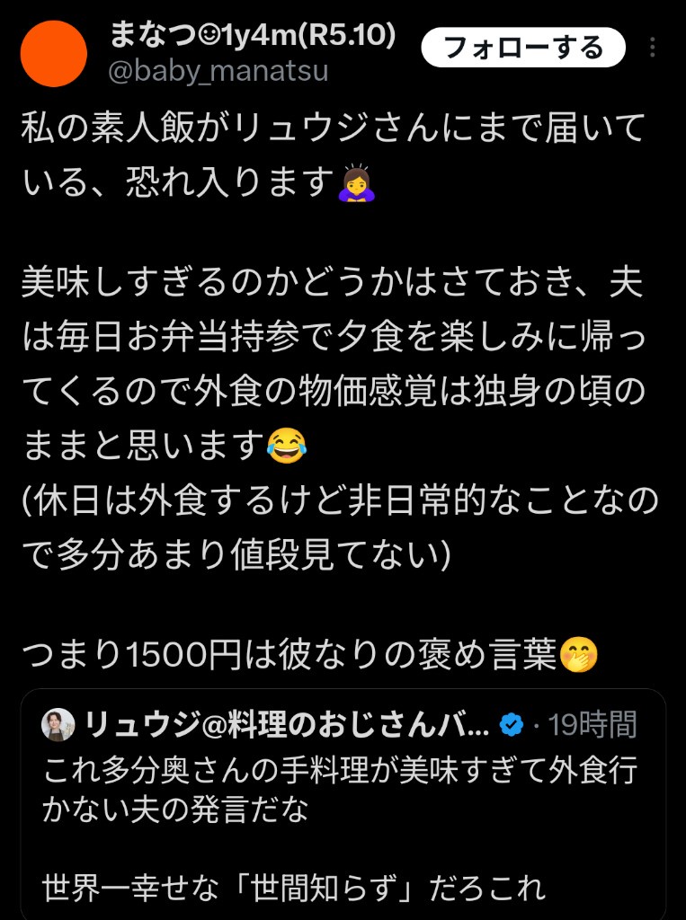 ちゃんと最初から外食行ったことねぇ旦那さんだなって言ってるしそのままのリプかえって来てるし