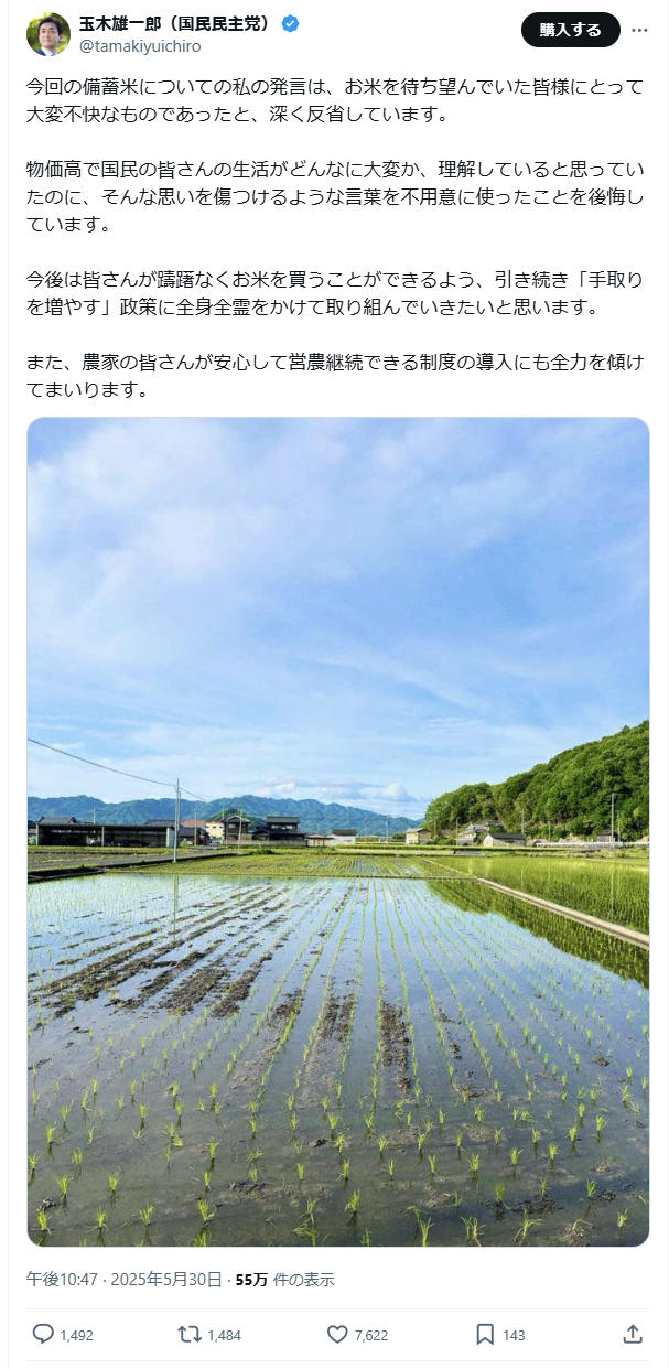 国民玉木「今回の備蓄米についての私の発言は、お米を待ち望んでいた皆様にとって大変不快なものであったと、深く反省しています