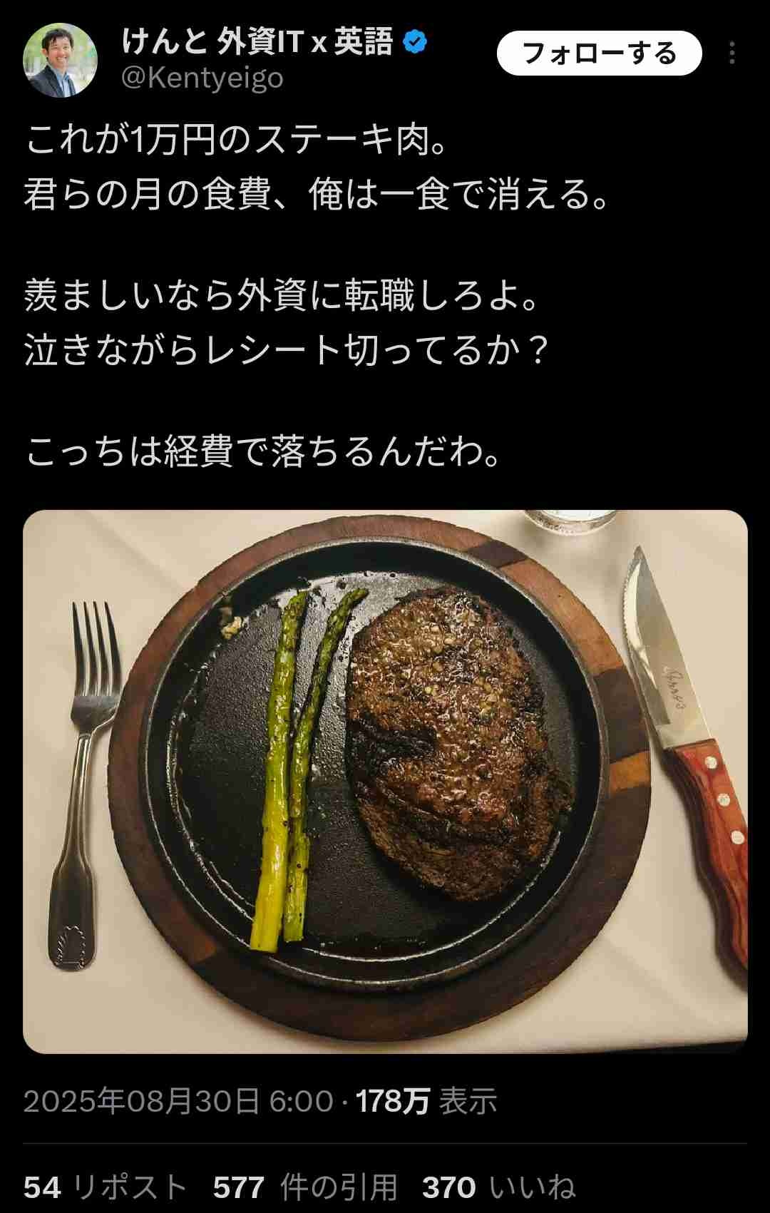 俺はこないだ自腹で2万円のステーキ食ったけど