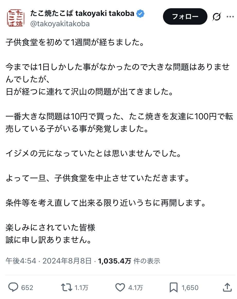 一番大きな問題は10円で買った、たこ焼きを友達に100円で転売している子がいる事が発覚しました。