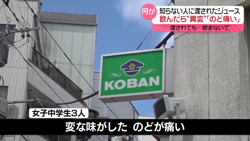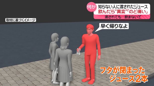 「知らない人から渡されたジュースを飲んだらのどが痛い」などと女子中学生が訴え治療を受けました。現場近くの学校では注意喚起もあったということです。