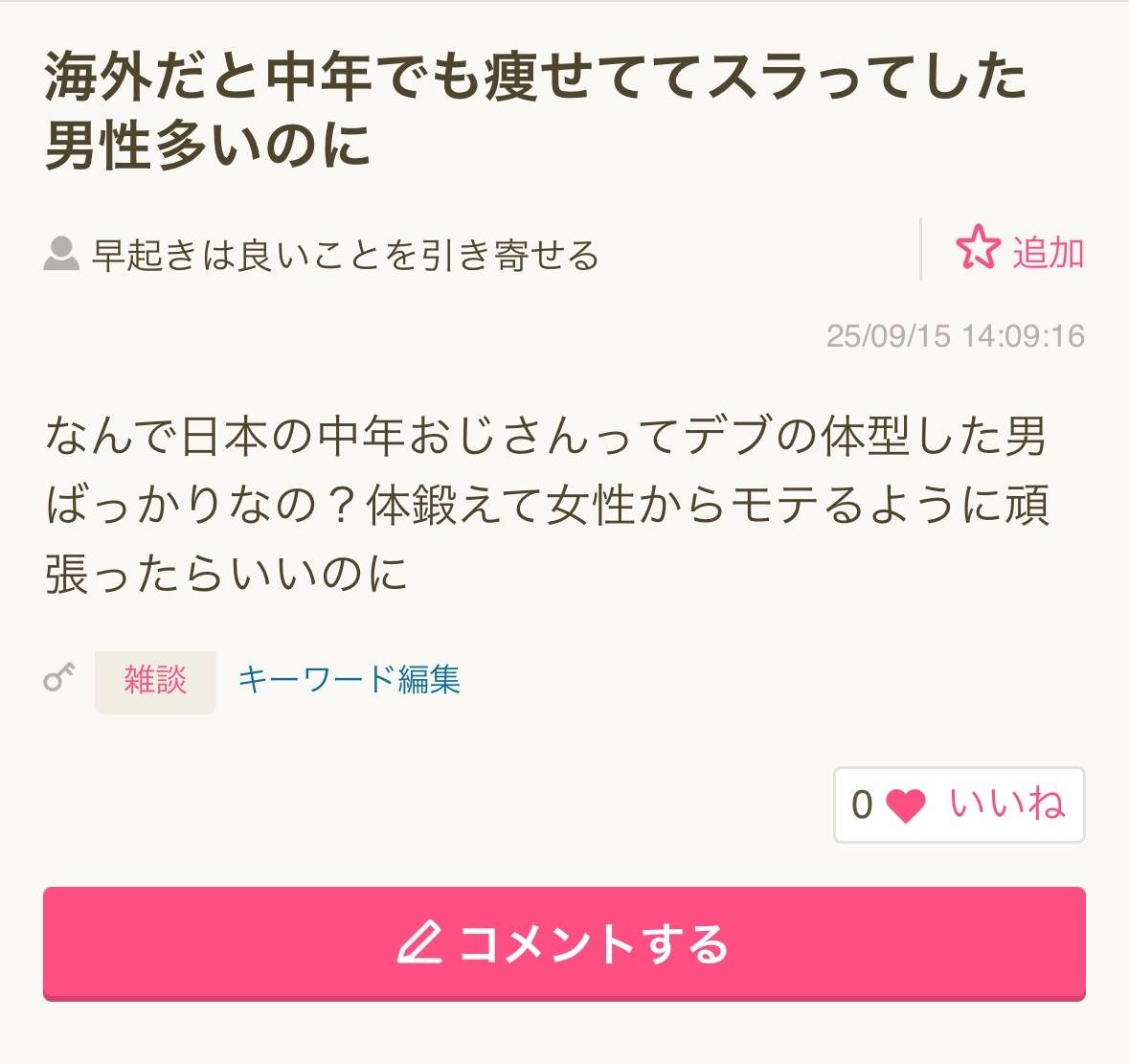 なんで日本の中年おじさんってデブの体型した男ばっかりなの?体鍛えて女性からモテるように頑張ったらいいのに