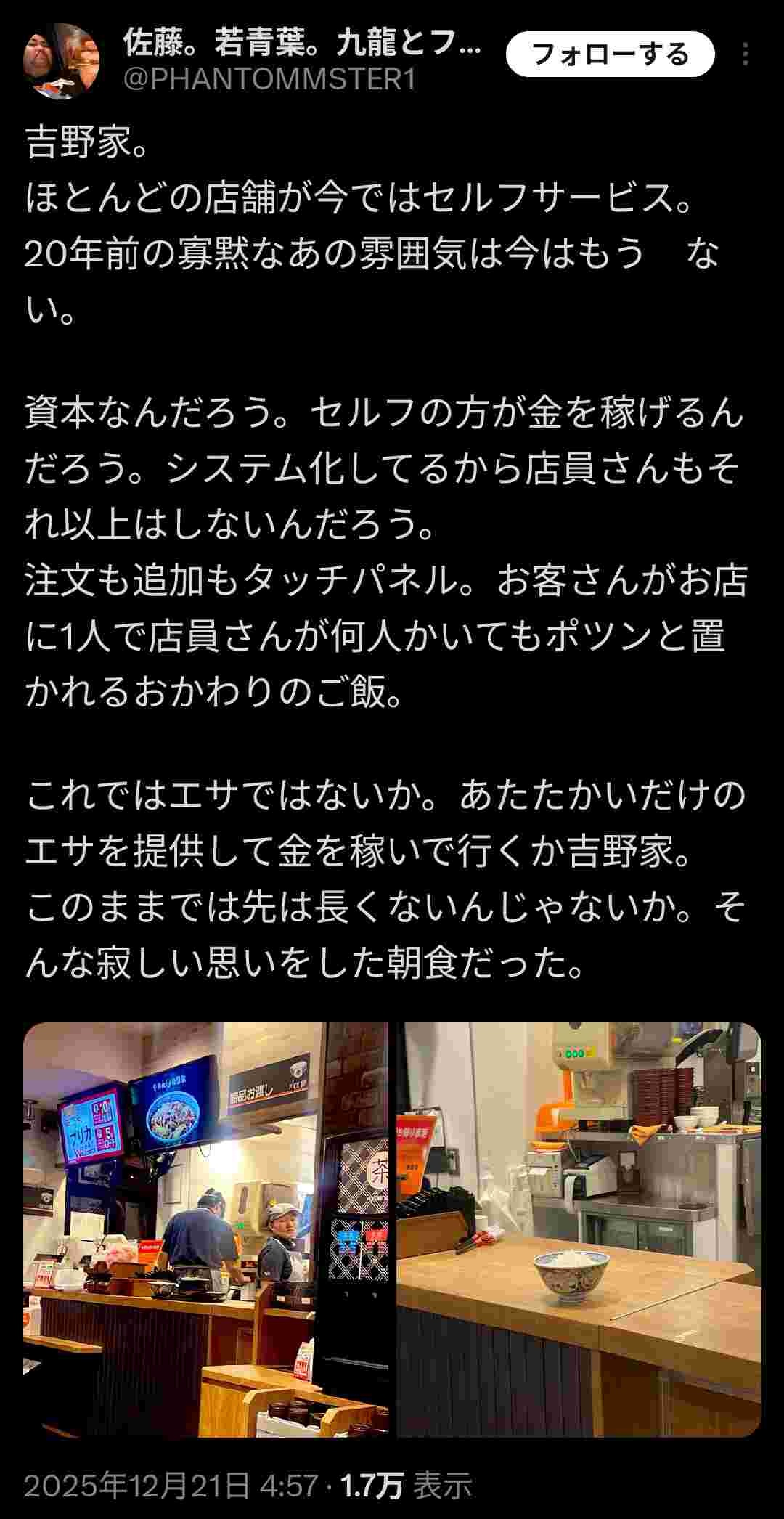 吉野家至上主義ジジイって、今のファミレス吉野家どう思ってんだろうな