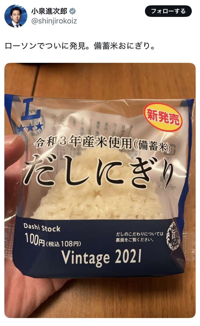 小泉農相「ローソンでついに発見。備蓄米おにぎり。」