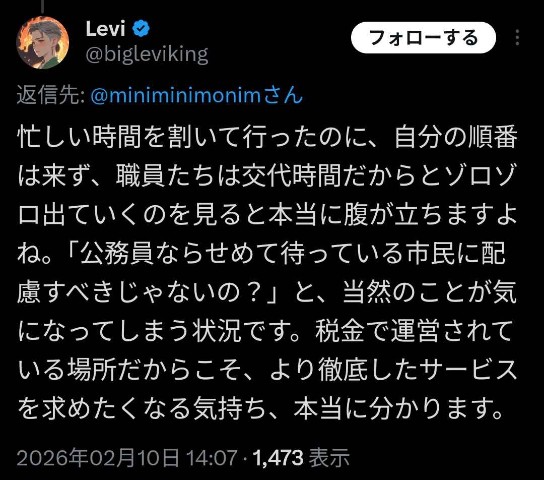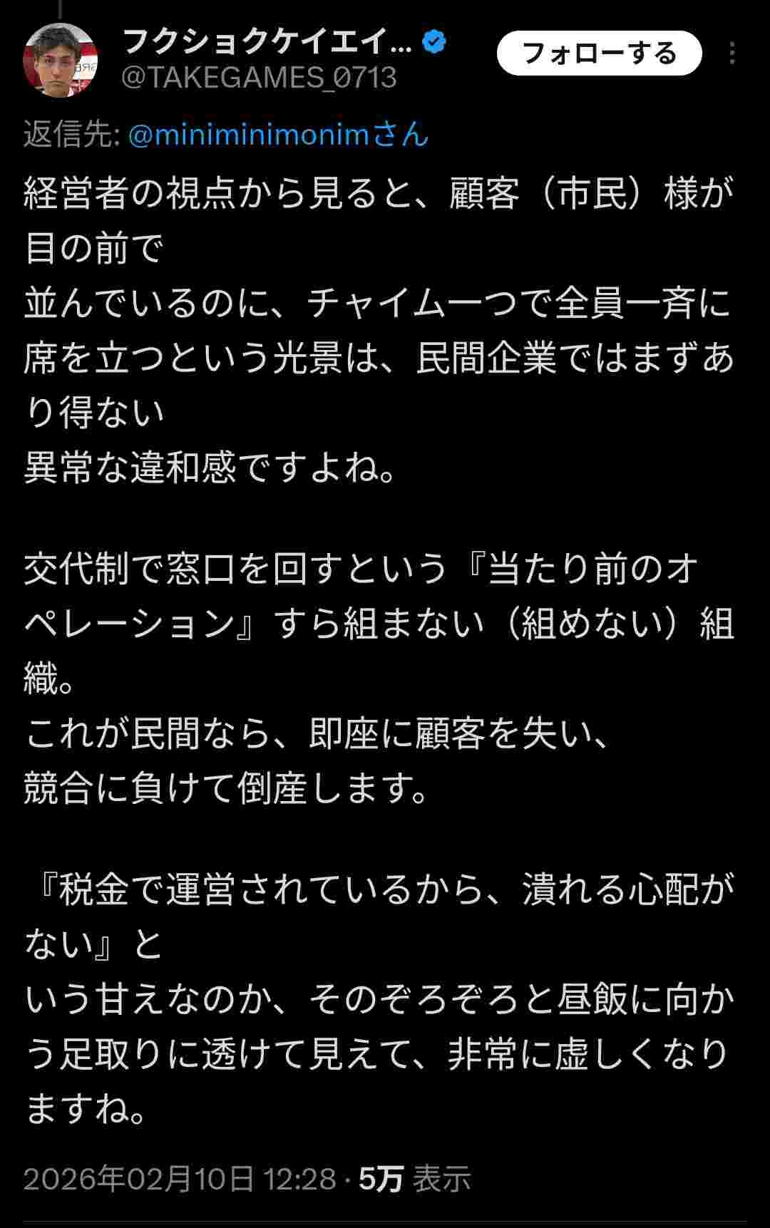 昼休み行く職員を混んでる窓口にフルに投入して、行列を減らしてから休み取れ、と言いたいんだよ