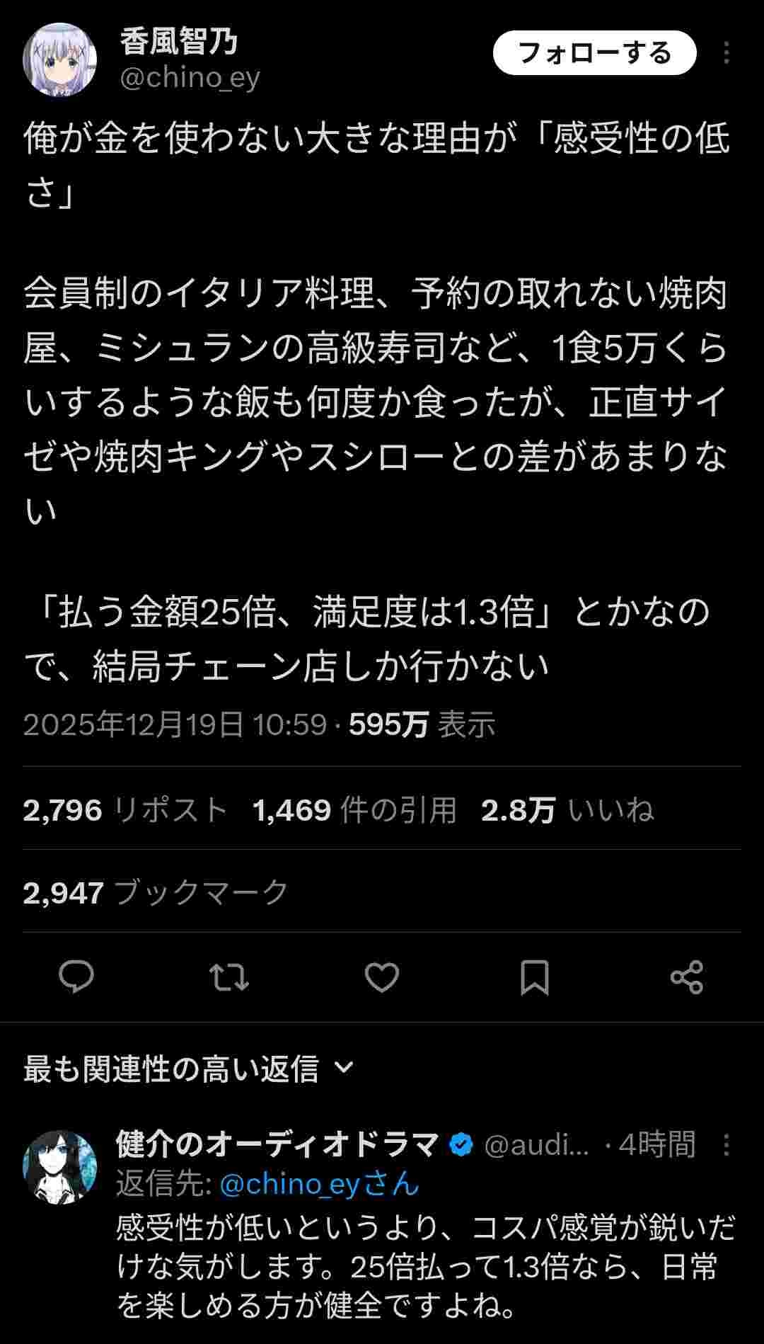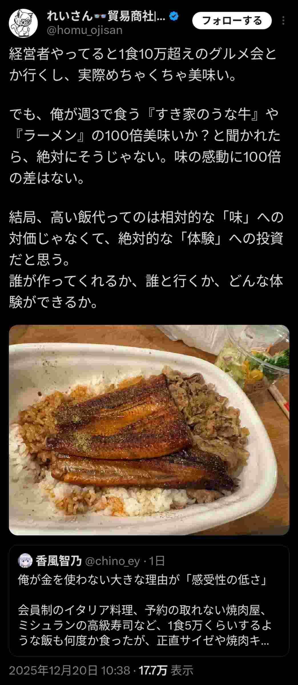 美味さではなく10万円を払って飯を食ったという経験を10万円払って手に入れている