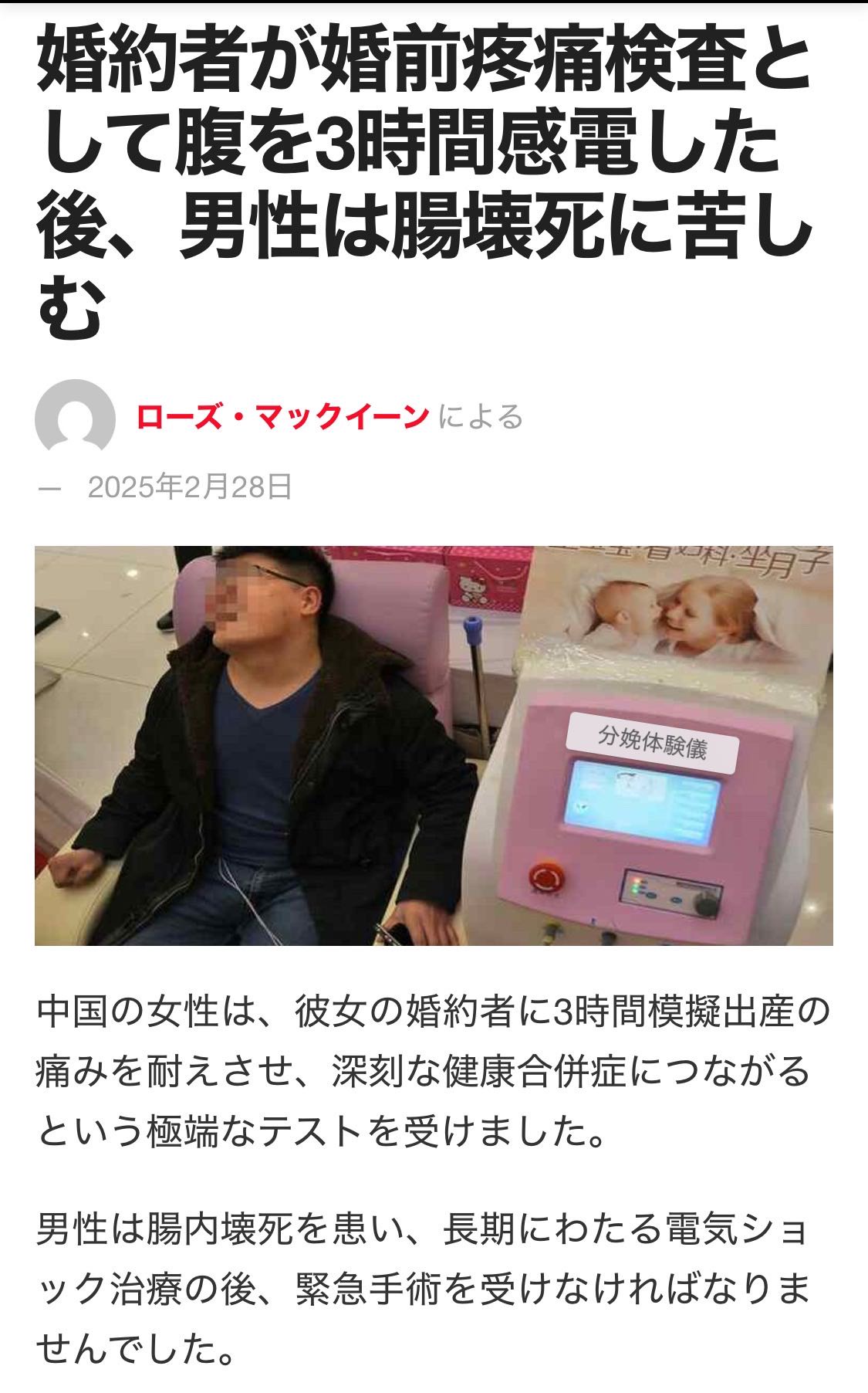 婚約中の女性が、将来の夫に「出産の痛み」を体験させるために3時間にわたり電気ショックを与えた結果、彼は腸壊死を起こし緊急手術を受けることになったのだ——。