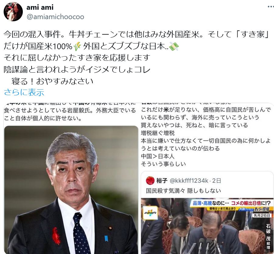 愛国者おこ「すき家だけが国産米なんだよ! 他の店は外国産! 異物混入に負けるな! 応援しましょう!」
