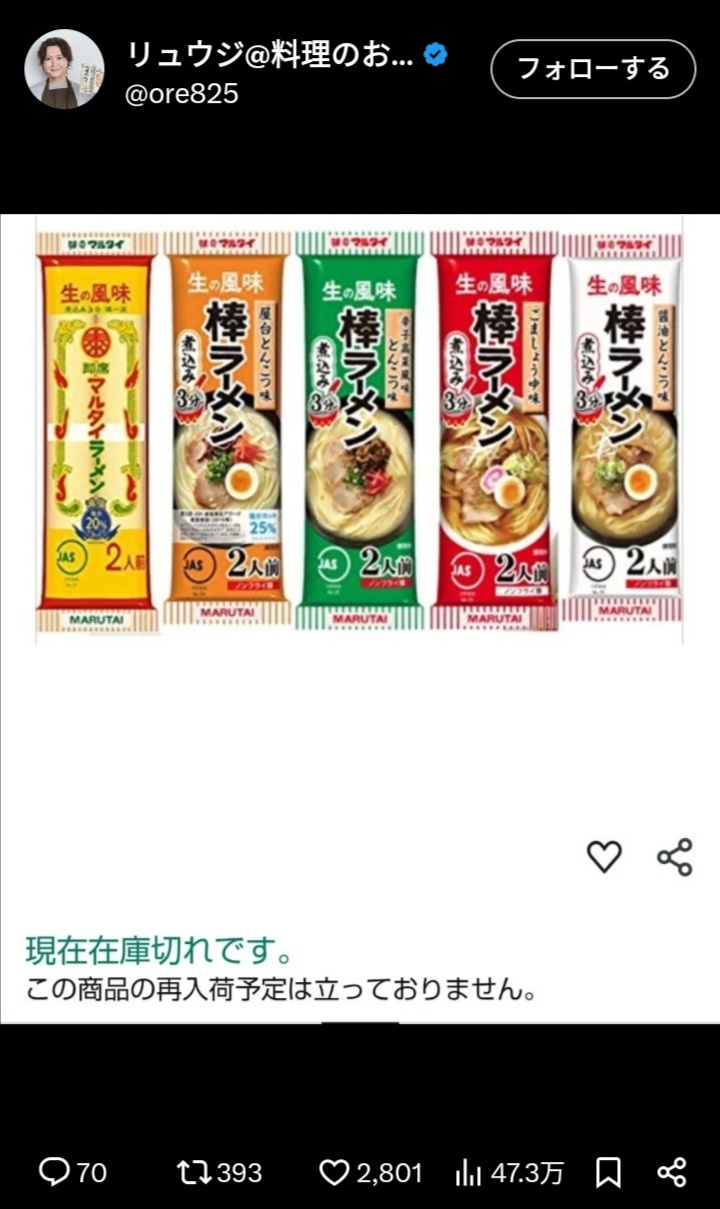 料理研究家リュウジさんのせいでマルタイ棒ラーメンがスーパーから消える!またバカに見つかってしもうた!