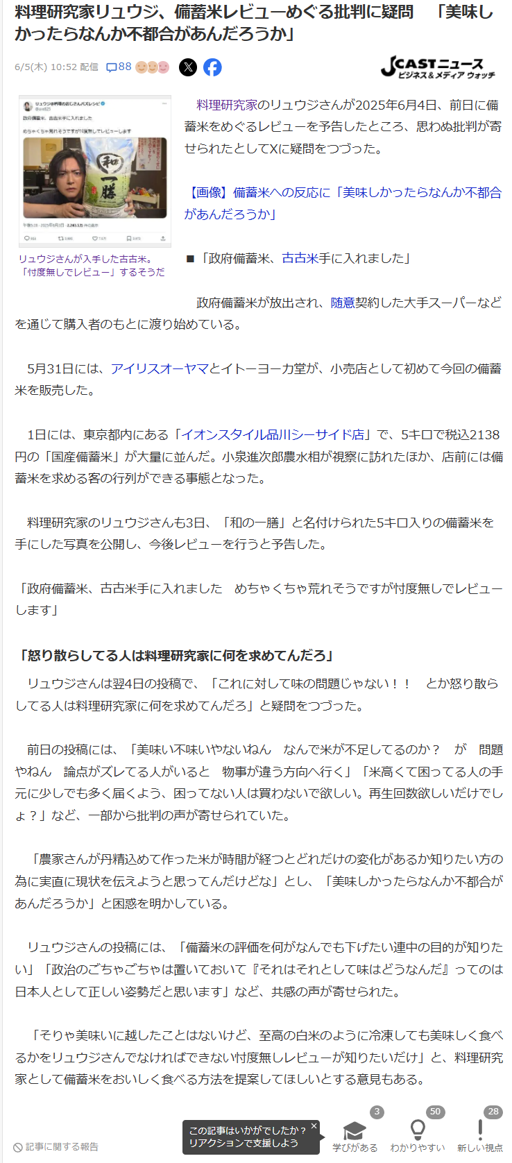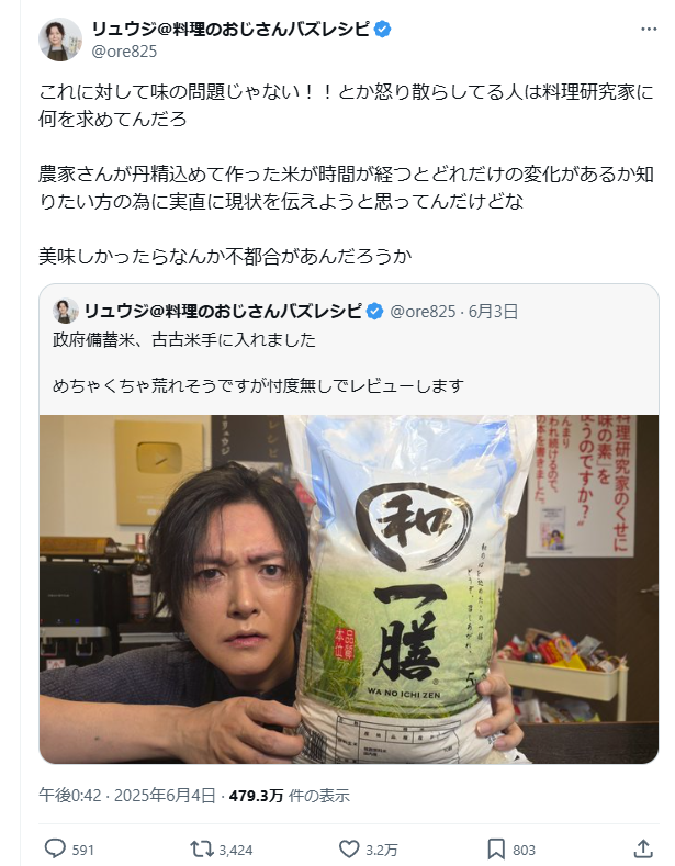 料理評論家リュウジ「美味しかったらなんか不都合があんだろうか」備蓄米レビュー予告炎上、終わりだよこの国