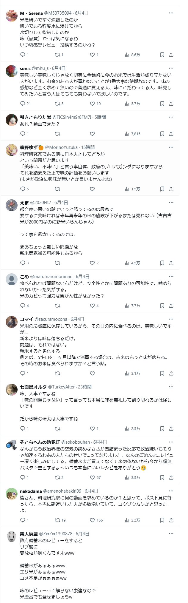 「そりゃ美味いに越したことはないけど、至高の白米のように冷凍しても美味しく食べるかをリュウジさんでなければできない忖度無しレビューが知りたいだけ」と、料理研究家として備蓄米をおいしく食べる方法を提案してほしいとする意見もある。