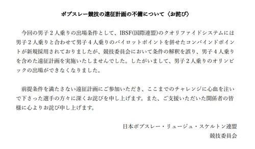 同連盟は「ボブスレー競技の遠征計画の不備について〈お詫び〉」と題したプレスリリースを公表。日本が出場を目指していた男子2人乗りの出場条件は、IBSF(国際連盟)のクオリファイド(予選)システムにおいて、男子2人乗りだけでなく男子4人乗りにも出場し、パイロットポイントを併せたコンバインドポイントを獲得する方式が新たに採用されていたが「競技委員会において条件の解釈を誤り、男子4人乗りを含めた遠征計画を実施いたしませんでした。したがいまして、男子2人乗りのオリンピックの出場ができなくなりました」と明らかにした。