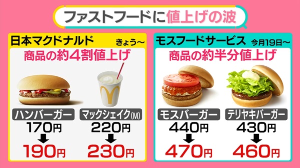「モスバーガーを展開するモスフードサービスは19日から、全体の半分近くを値上げします。モスバーガーは440円から470円に、テリヤキバーガーは430円から460円に引き上げられます。両社とも値上げの理由は、物流費や人件費の上昇を受けたものだといいます」