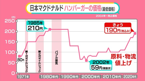 「こうしたハンバーガーの価格で、時代背景が見えてきました。日本マクドナルドのハンバーガーの最低価格の変遷を50年にわたるグラフにしました」