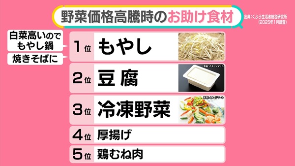 「買い物情報に関するサービスを手がける会社のグループが行った調査(くふう生活者総合研究所、2025年1月)によると、『野菜価格が高騰した時に頼るお助け食材は何?』という質問に対して、5位は鶏むね肉、4位は厚揚げ、3位は冷凍野菜、2位は豆腐でした」