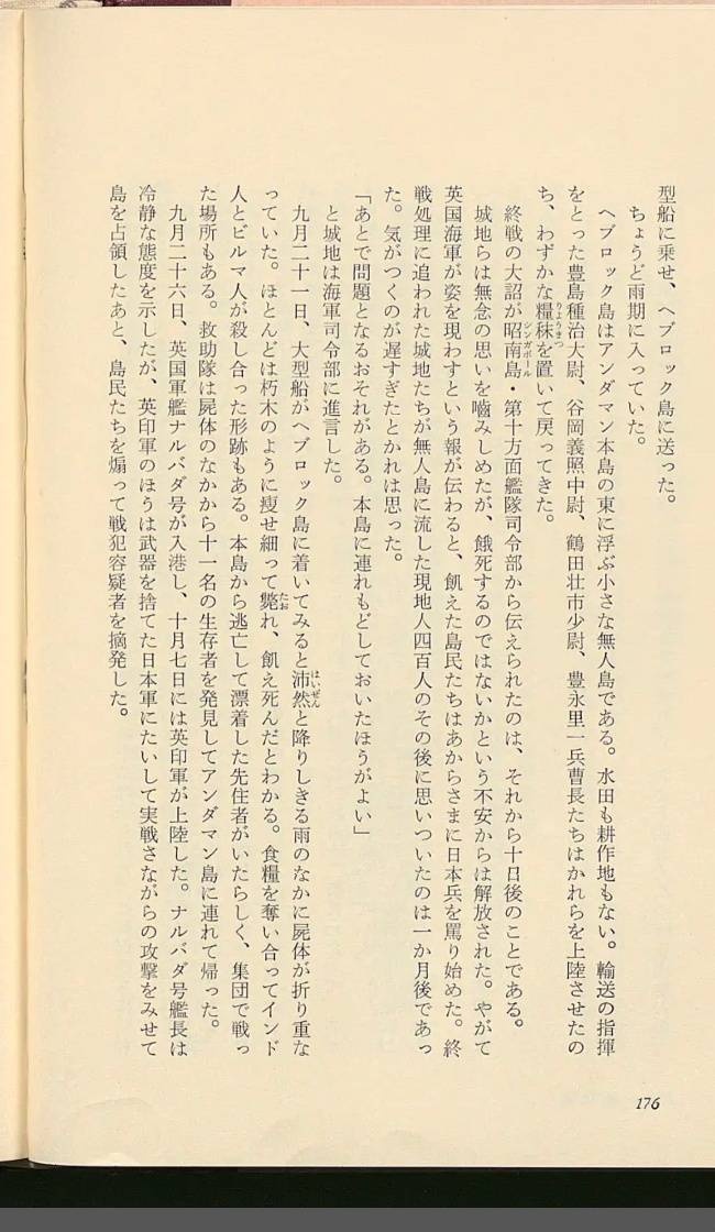 1945年8月初旬、海軍第12特別根拠地隊司令部は、南アンダマン島の約400人の住民を強制的に耕地のない無人島ヘブロック島へ移住させた。終戦後の1945年9月21日、この措置が戦争犯罪として問題視されることを恐れて救助に行ったところ、住民の餓死体が折り重なっているのを発見し、救助された生存者は11名のみだった(ヘブロック島事件)[86]