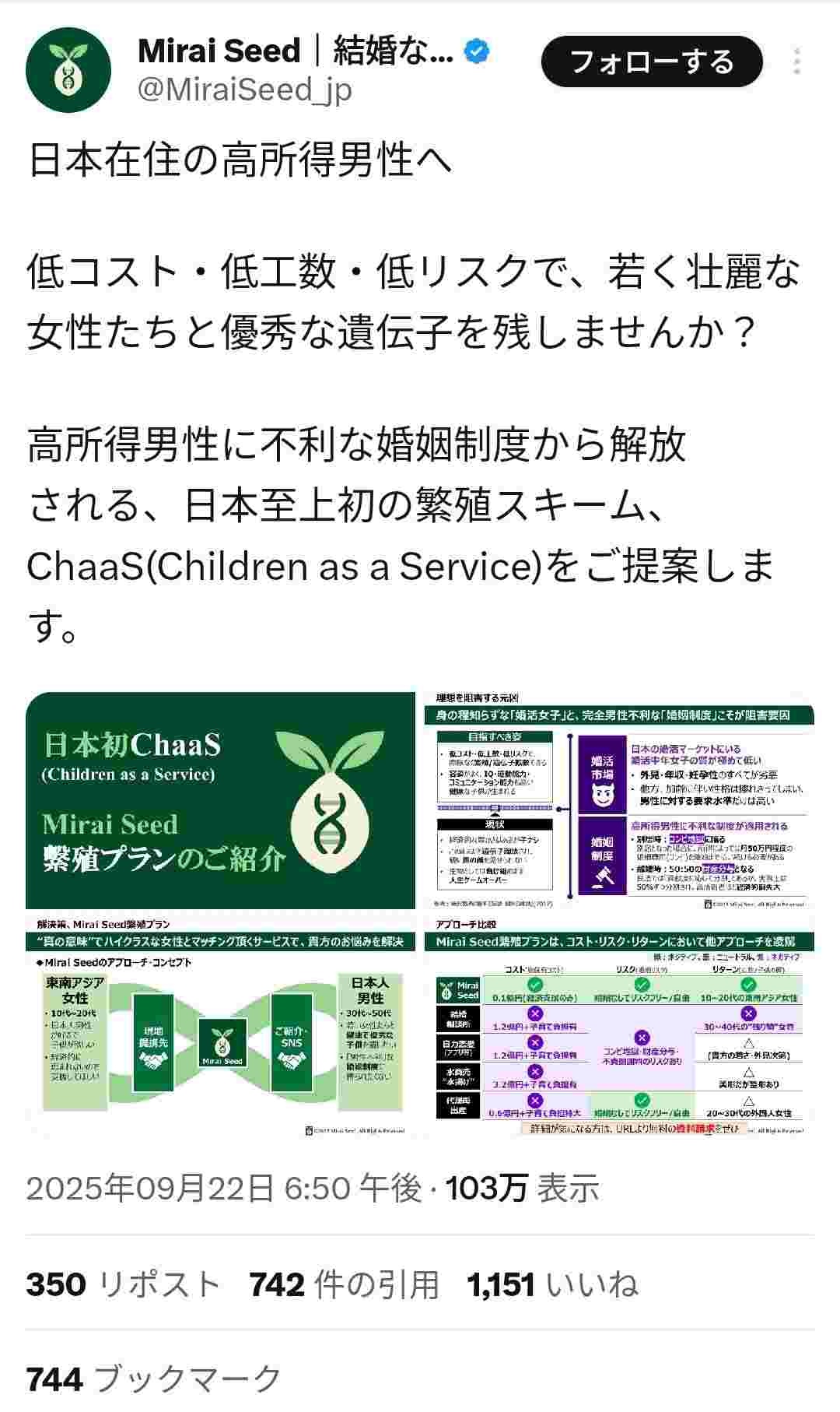 東南アジアの若い女子をハイスペおじさんにあてがう子作りサービス、開始www