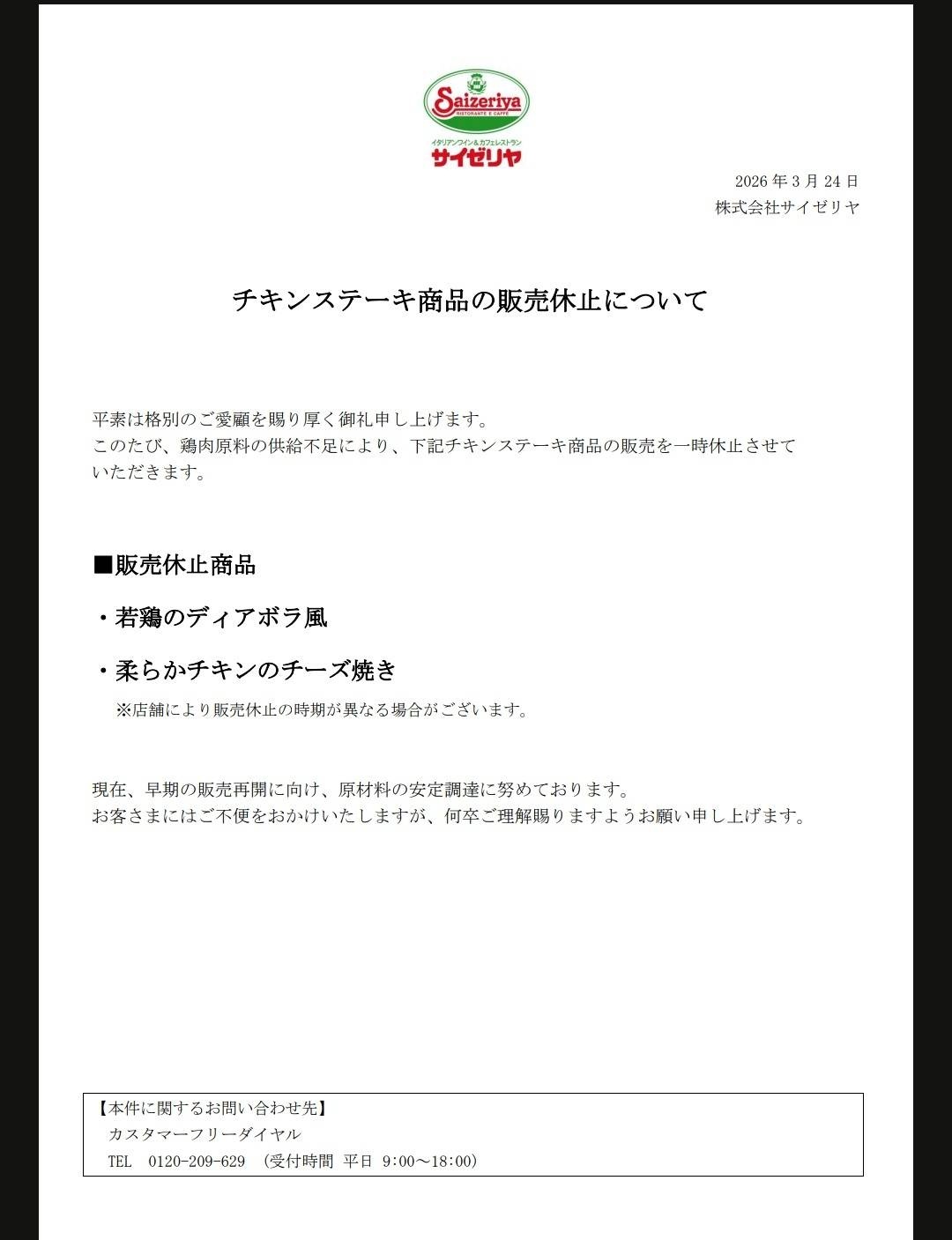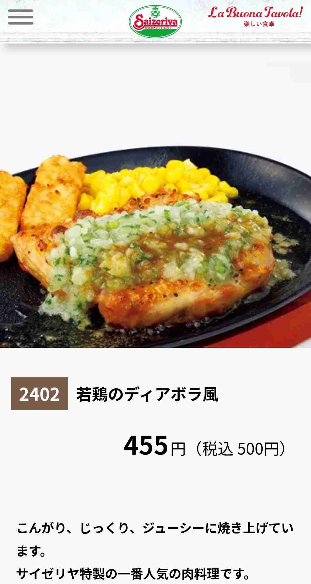 https://www.matsuyafoods.co.jp/matsuya/kobetsu/gentei.htmlサイゼリヤ、チキンステーキ商品を販売休止 「若鶏のディアボラ風」「柔らかチキンのチーズ焼き」対象 原料供給不足の影響