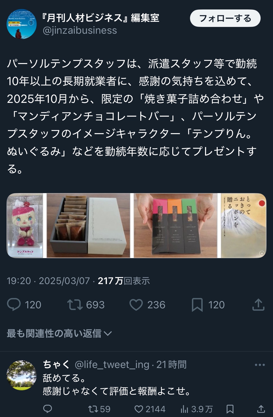 派遣会社「10年勤めてくれた派遣さんにはぬいぐるみや焼き菓子セットをあげます♪」