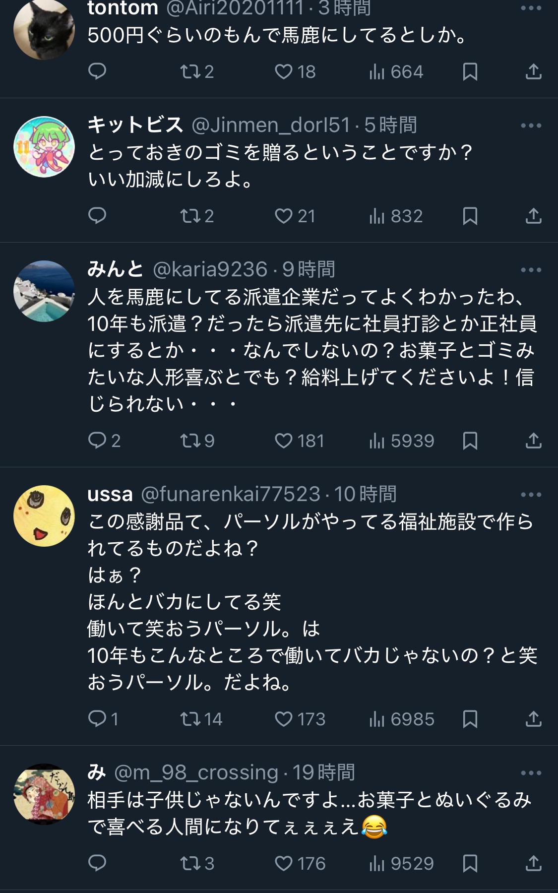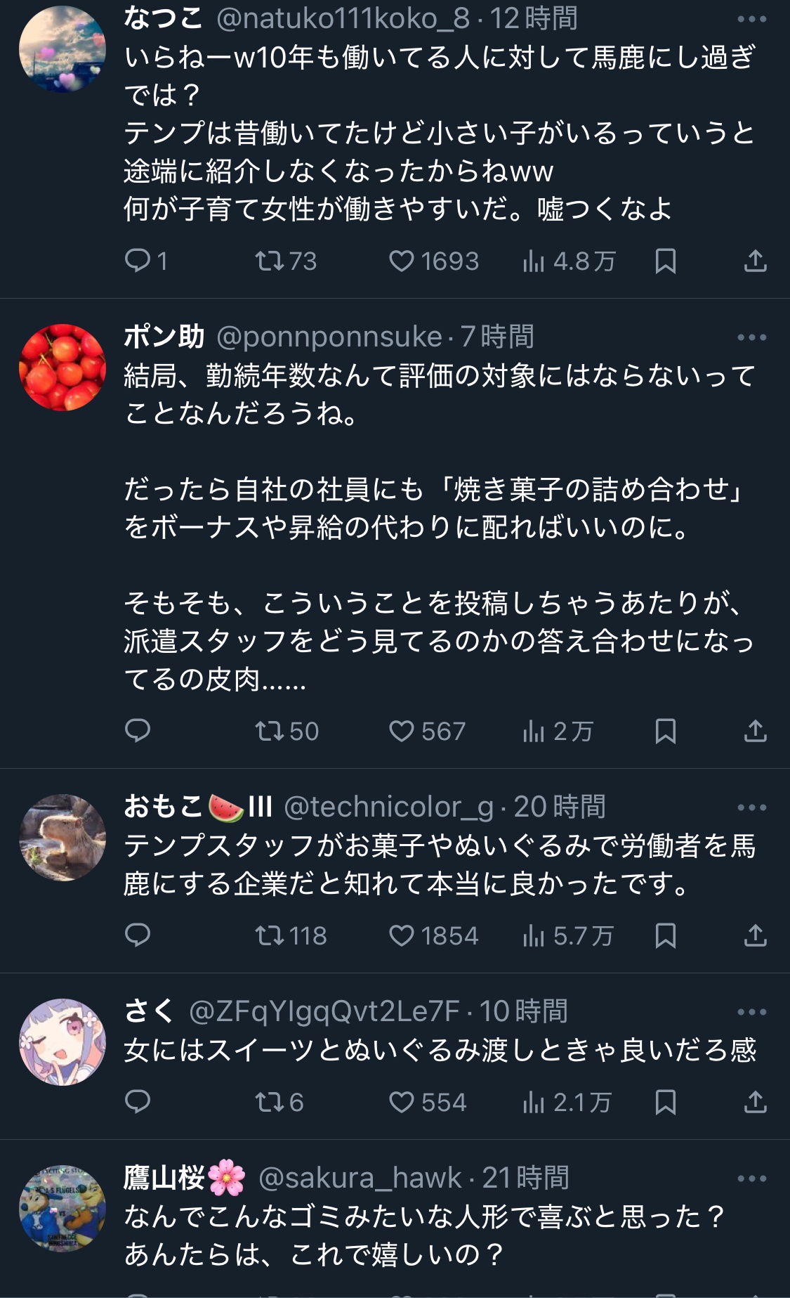 お菓子あげれば派遣の皆さんは喜んでくれるはず♪とか思ったのかね - 40 : 2025/03/09(日) 21:12:40.29 ID:v2mtAyrX0