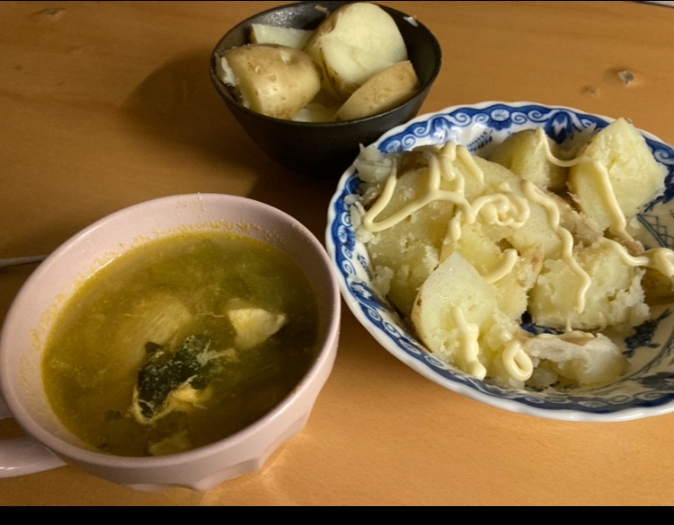スープ山盛り作ったからそっち食ってたらお茶碗のいもはお腹いっぱいで入らないわ