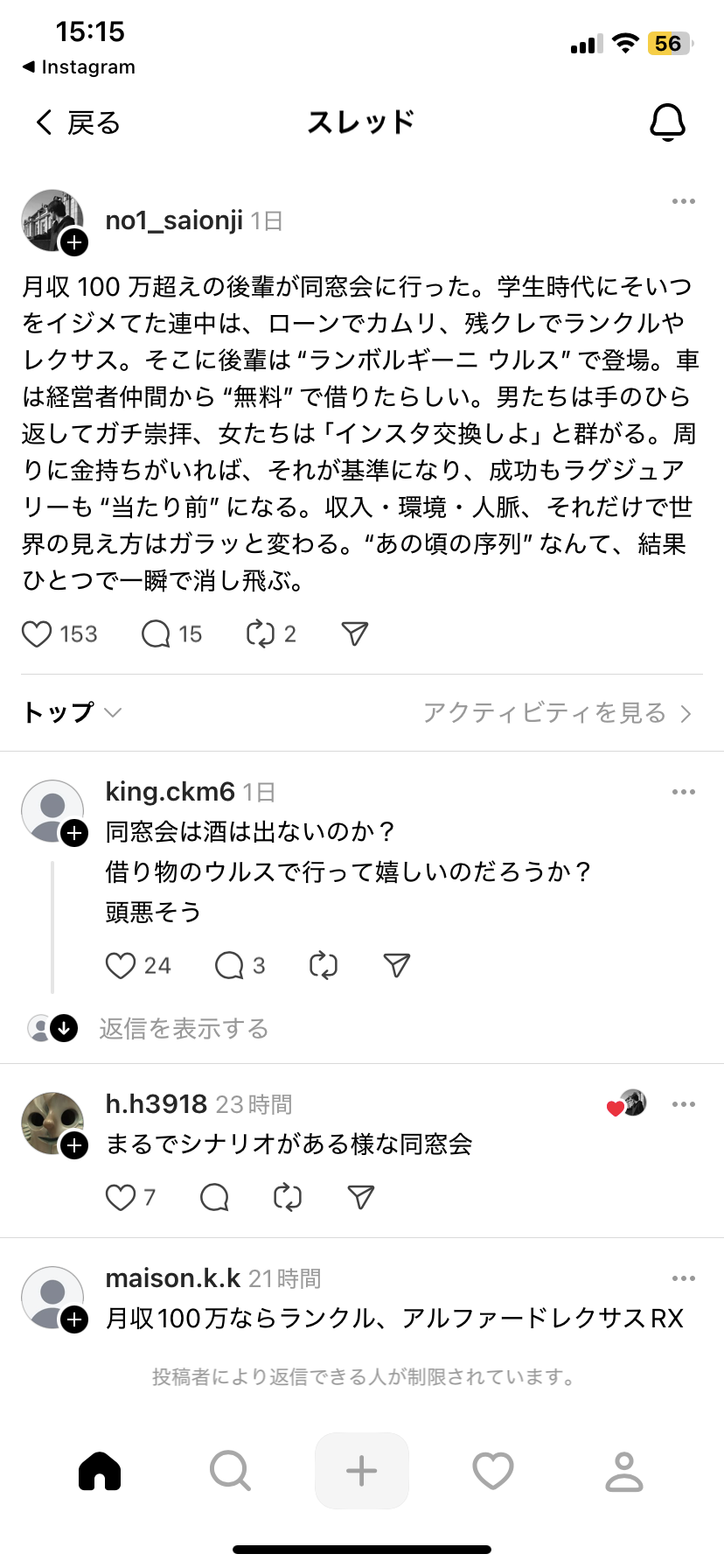 月収 100万超えの後輩が同窓会に行った。学生時代にそいつをイジメてた連中は、ローンでカムリ、残クレでランクルやレクサス。